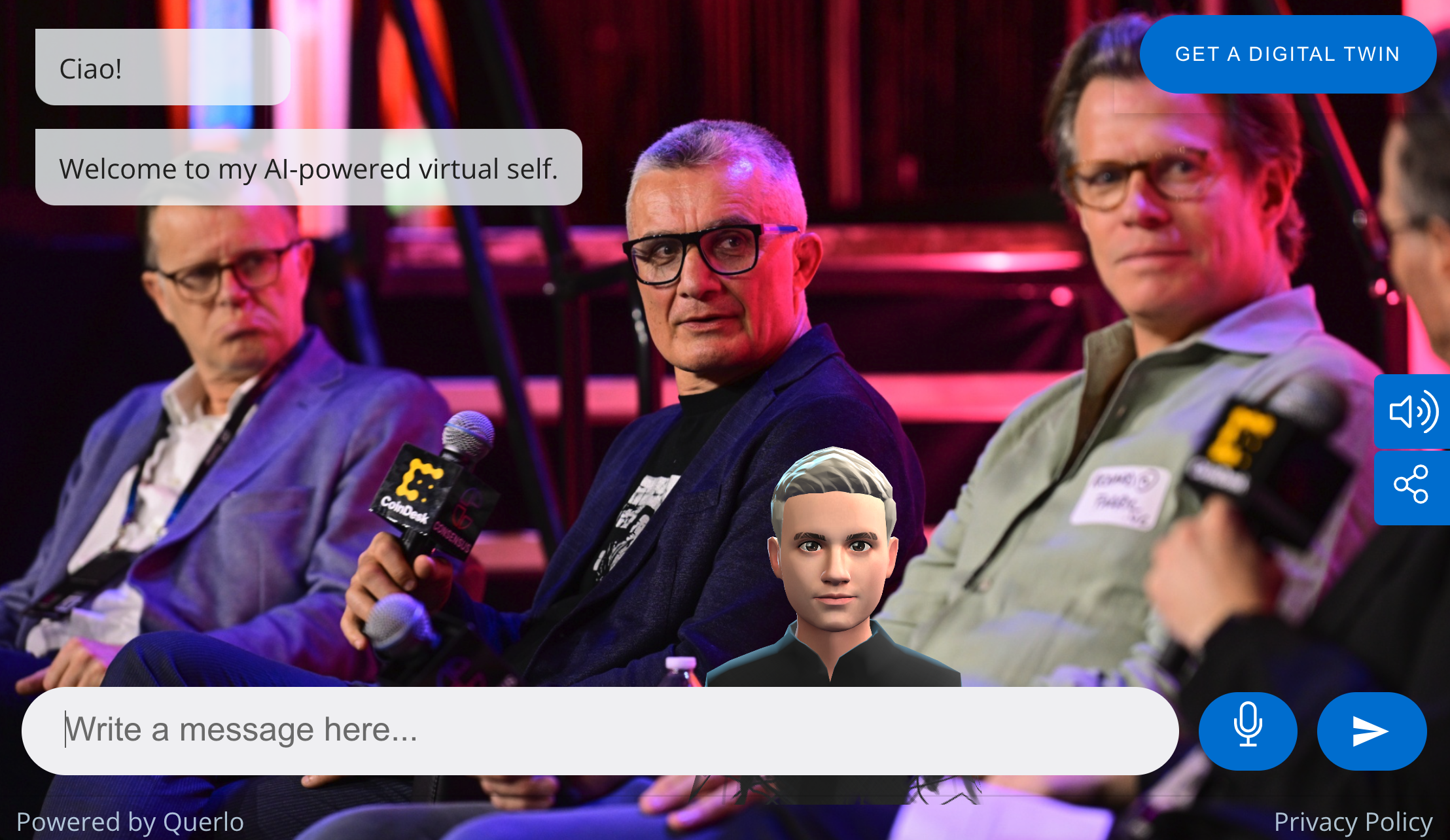 A Querlo Digital Twin is a personal AI assistant that communicates for you, 24/7, on websites, social media, event platforms, and more.